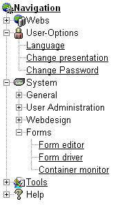 Forms can only be created and administrated by a central webmaster. The Form Editor can be found in the navigation tree under the item “System Forms”. This is also the location of two further elements you need for your work with forms – the form drivers and the Container Monitor (see below).