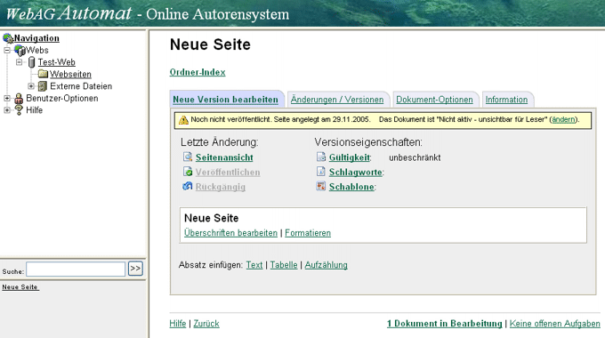 Abbildung 1 - "Neue Seite" in Bearbeitung